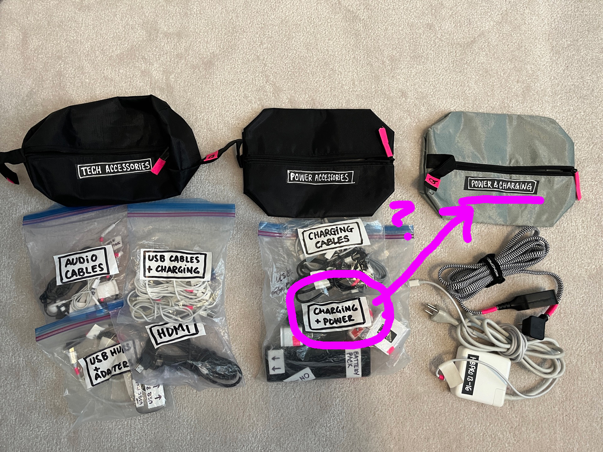 These are my travel kits. In my backpack, I have three pouches: “Tech Accessories,” “Power Accessories,” and “Power & Charging.”