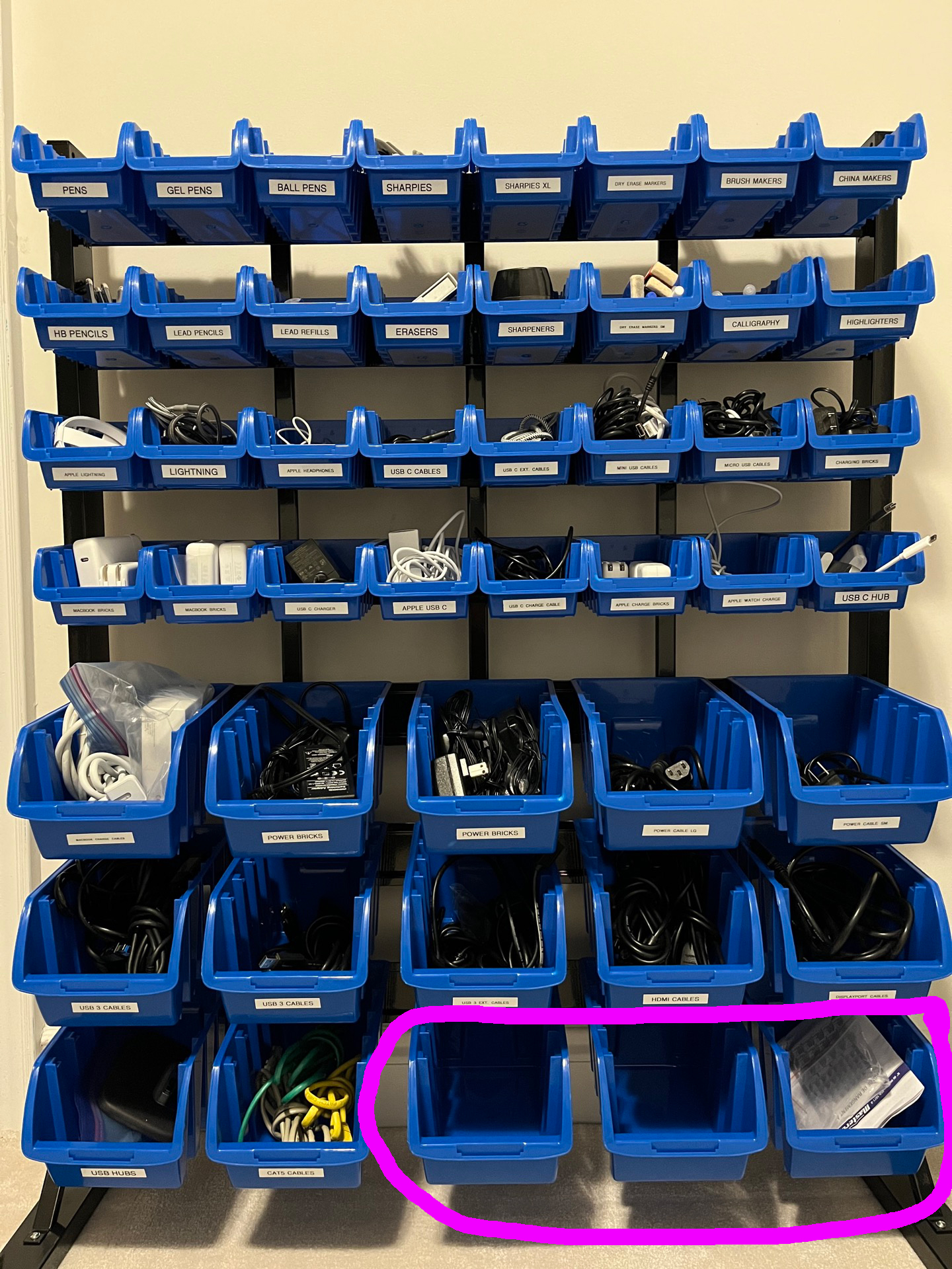 And at first, it worked. The office things went in the office area. All the cables, chargers, and adapters went in the tech bins. Obviously.