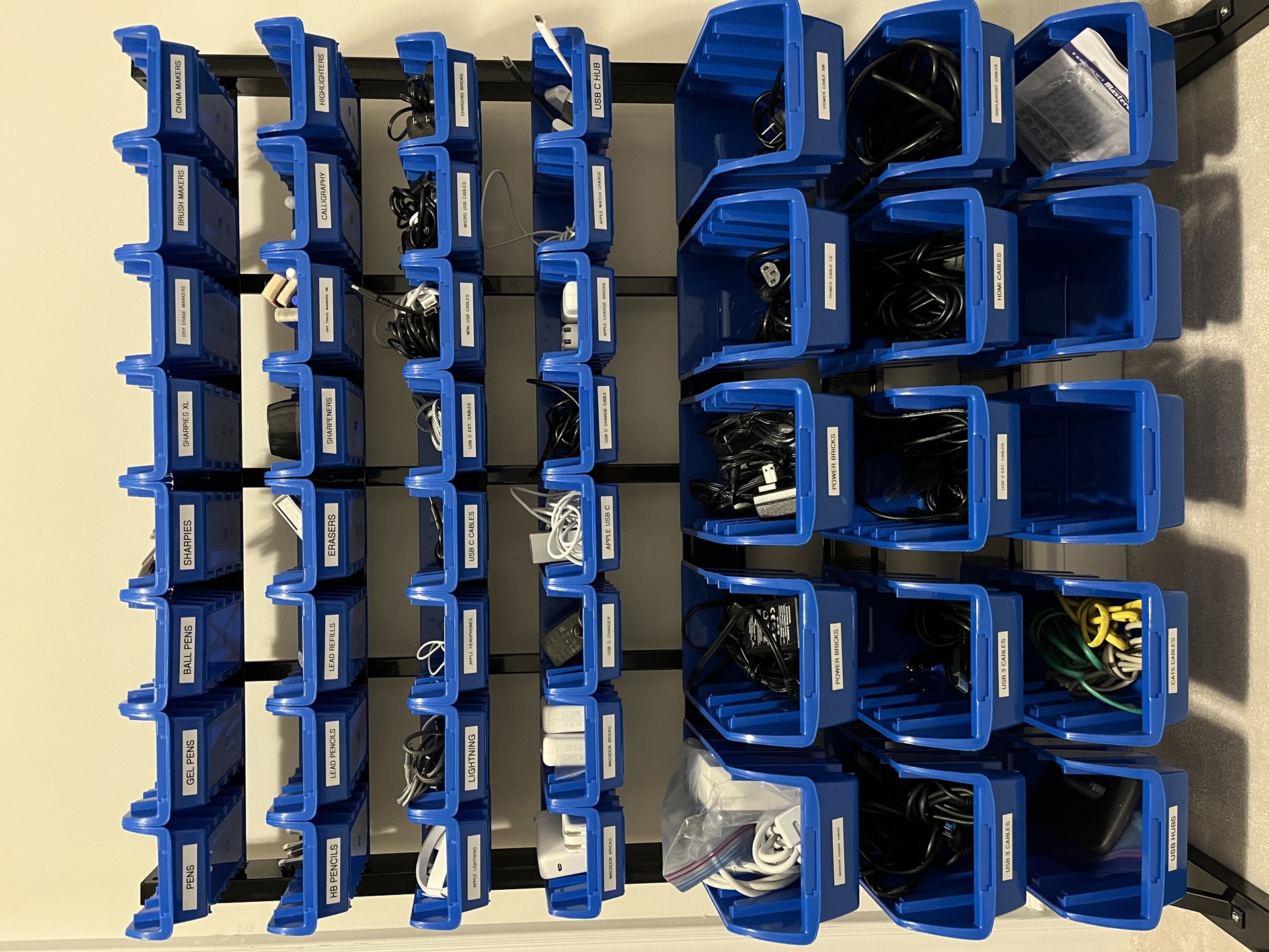 Rows of clearly labelled bins: pens, markers, USB-C hubs, HDMI cables. Everything intentional… except for the bottom bins.